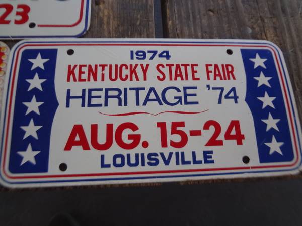I have three Kentucky state fair booster vanity plates and as you can see from the pictures look great for 50 plus years old. The price is $35 each or buy all three for $100. If interested you can message or call me on my home phone between 10 a.m. and 10 p.m.