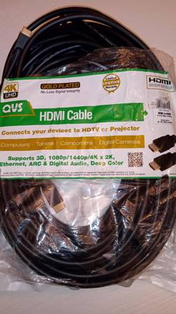 Never used 98.42 feet of HDMI gold plated cable with Ethernet capability. From QVS. Ultra HD. Hi speed. 4K 60 hz. Hybrid copper and fiber cable. For home theater systems, security systems, etc. Pick...