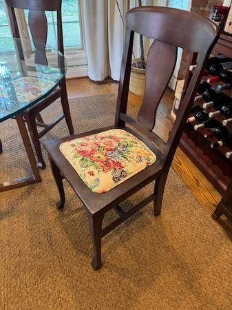 Like new Crate and Barrel dining table with a brass base and glass top. Top is 47” round. Perfect condition! $400 firm. Cash and pickup only, please. Four antique/custom upholstered chairs also...