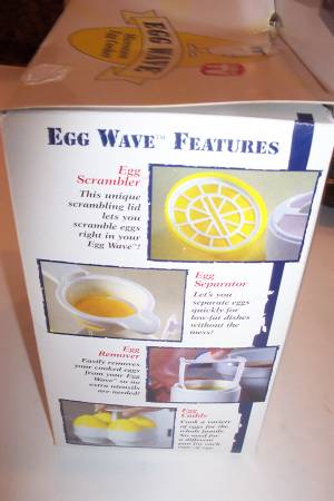 EGGIES, EGG WAVE MICROWAVE COOKER, ETC LOT of EGGIES, EGG WAVE (missing one) and miscellaneous items seen in picture Hard boiled egg cooker Microwave egg cooker scramble