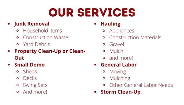 Derby City Disposal offers a variety of services including: Junk Removal; Full Property Clean-Outs; Light Demo; Yard Waste Removal; Moving; and More! We are fully licensed and insured with a 5-Star customer rating on Google and Facebook. Give us a call today at 502-330-0655 to schedule a free estimate or visit us on the web at www.derbycitydisposal.com to learn more.
