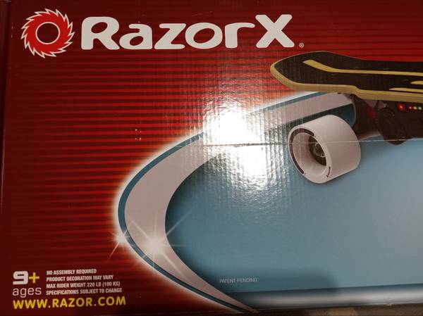 Brand new in the box, an electric wood longboard from RazorX. Video provided showing it works. It is for 10+ years on up and max weight is 220lbs. Never used. Look at pics for measurements. No delivery. Pick up is at Hikes Point. $160
